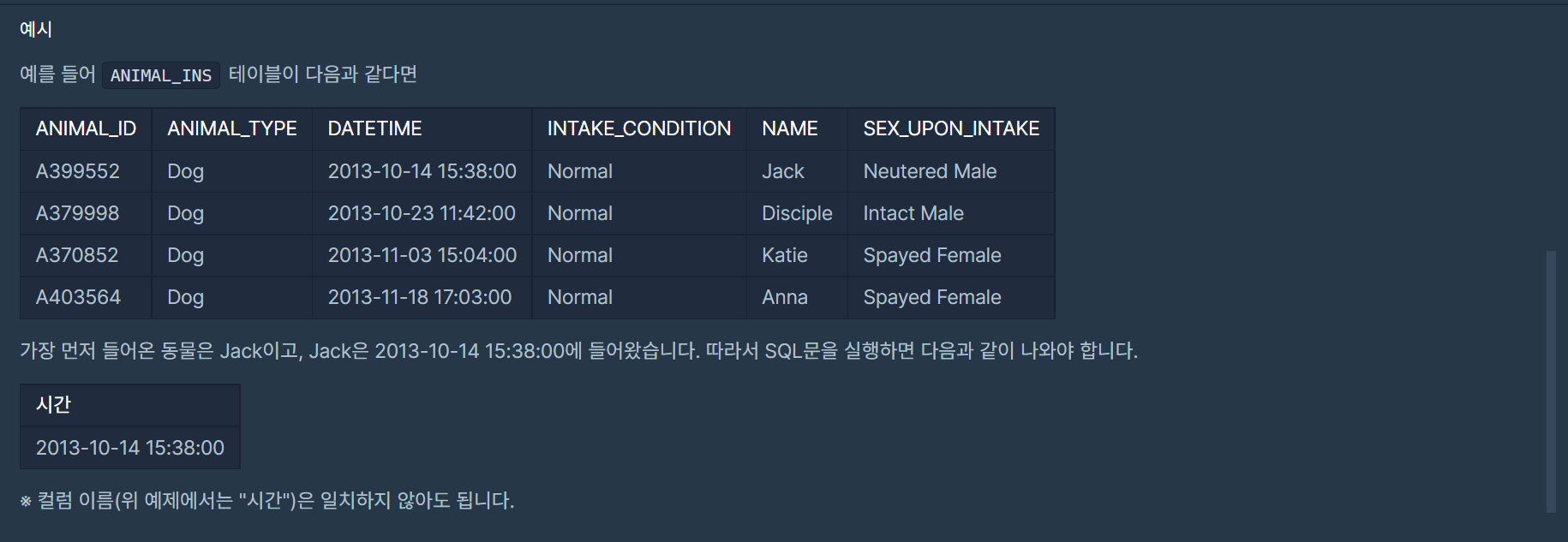 2. 가장 먼저 들어온 동물의 DATETIME 출력