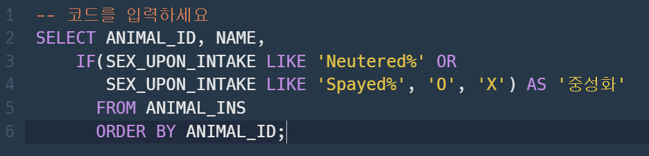 우선 동물의 아이디와 이름, 중성화 여부를 출력하겠다.