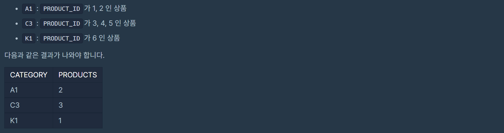 카테고리 별 상품 개수 구하기 문제는 다음과 같다.