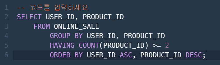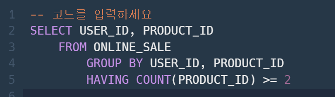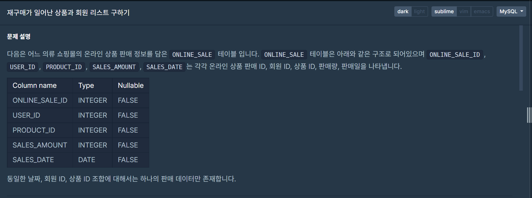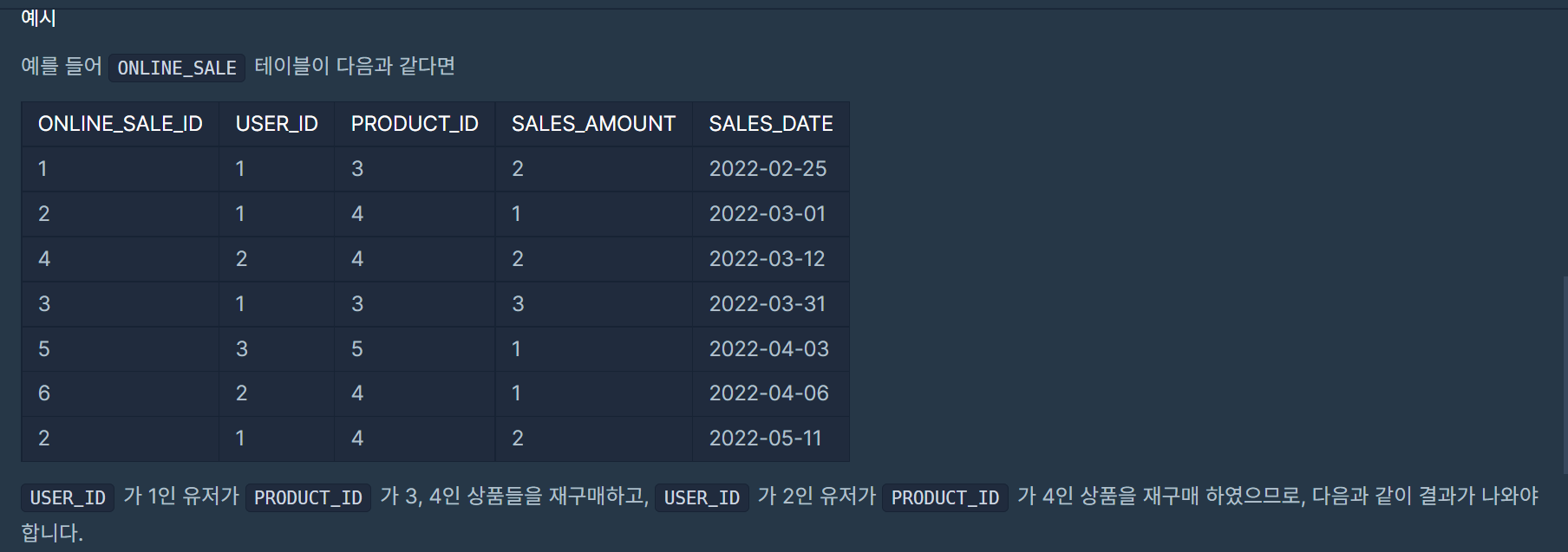 재구매가 일어난 상품과 회원 리스트 구하기 문제는 다음과 같다