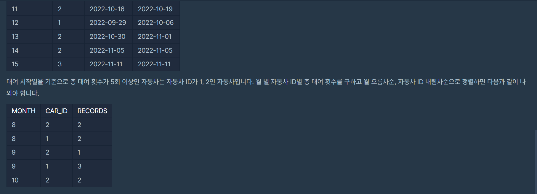 대여 횟수가 많은 자동차들의 월별 대여 횟수 구하기 문제는 다음과 같다.