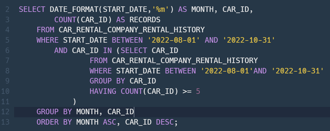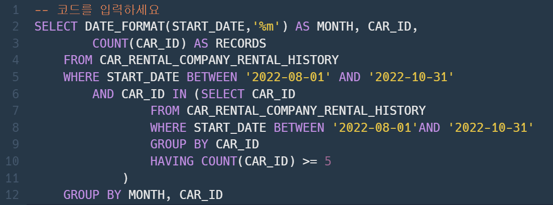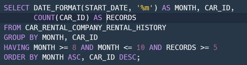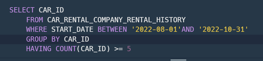8월부터 10월 사이의 CAR_ID별 대여횟수가 나오게 된다.