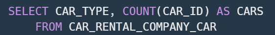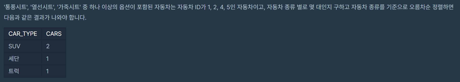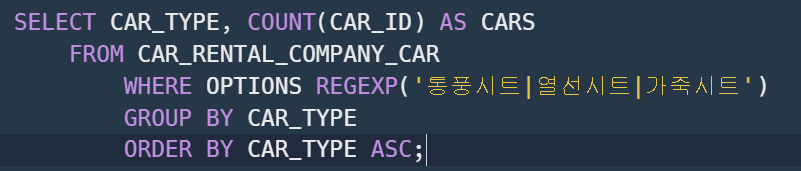 이를 위해 GROUP BY로 CAR_TYPE들을 묶어 주었다.