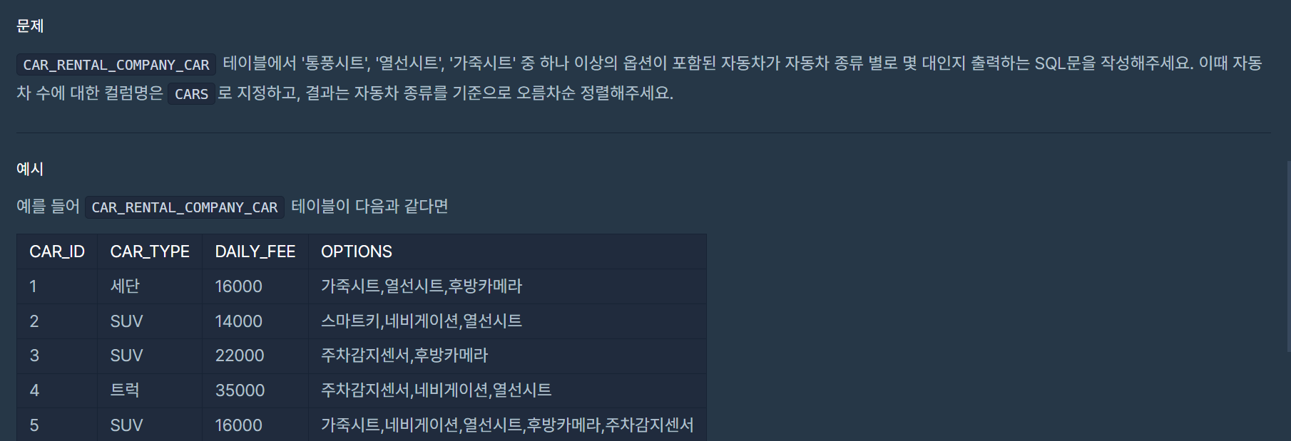자돟차 종류 별 특정 옵션이 포함된 자동차 수 구하기 문제는 다음과 같다.