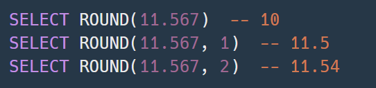 ROUND(숫자 또는 컬럼, 소숫점 자릿 수 지정) * 소숫점 자릿 수 지정하지 않을 경우 소수점 첫 번째 자리에서 반올림 |