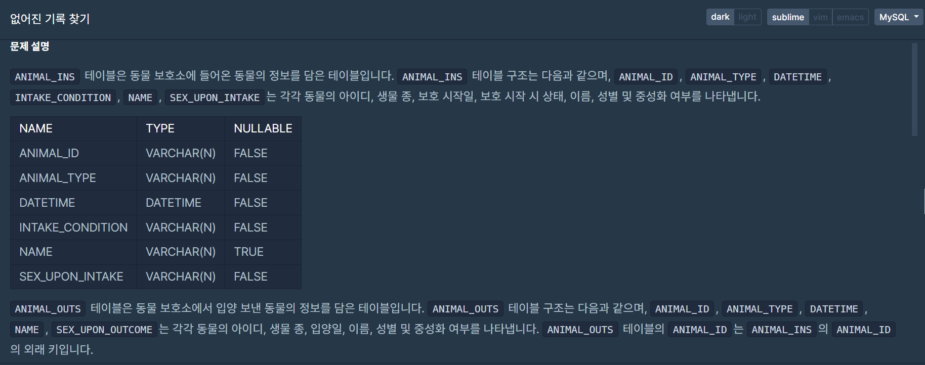 문제에서 각 테이블의 ANIMAL_ID가 기본키, 외래키로 사용한다고 명시되어 있으니