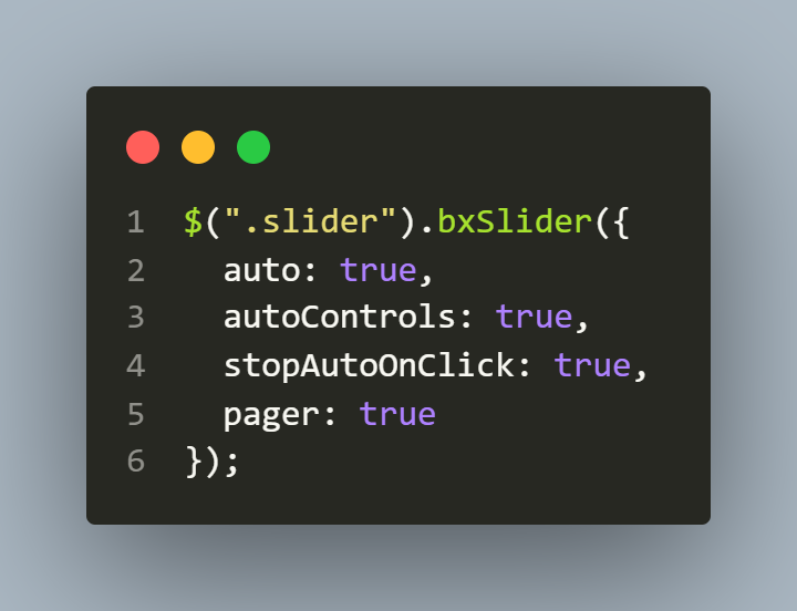 Initialize the bxSlider plugin This code tells the webpage to start the slider setup. Without this code the slider plugin would not be visible on the page.