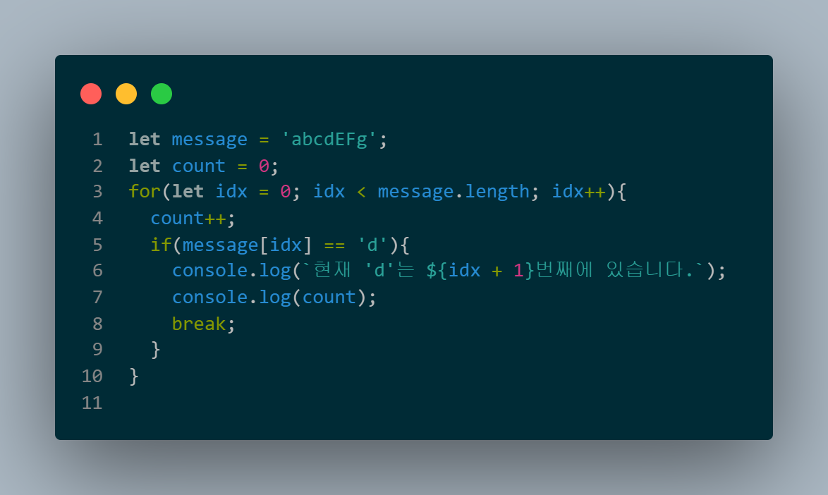 그러나 중간에 break문을 삽입하게 되면 해당 배열을 끝까지 돌지 않고 중간에 반복문을 탈출하게 된다.