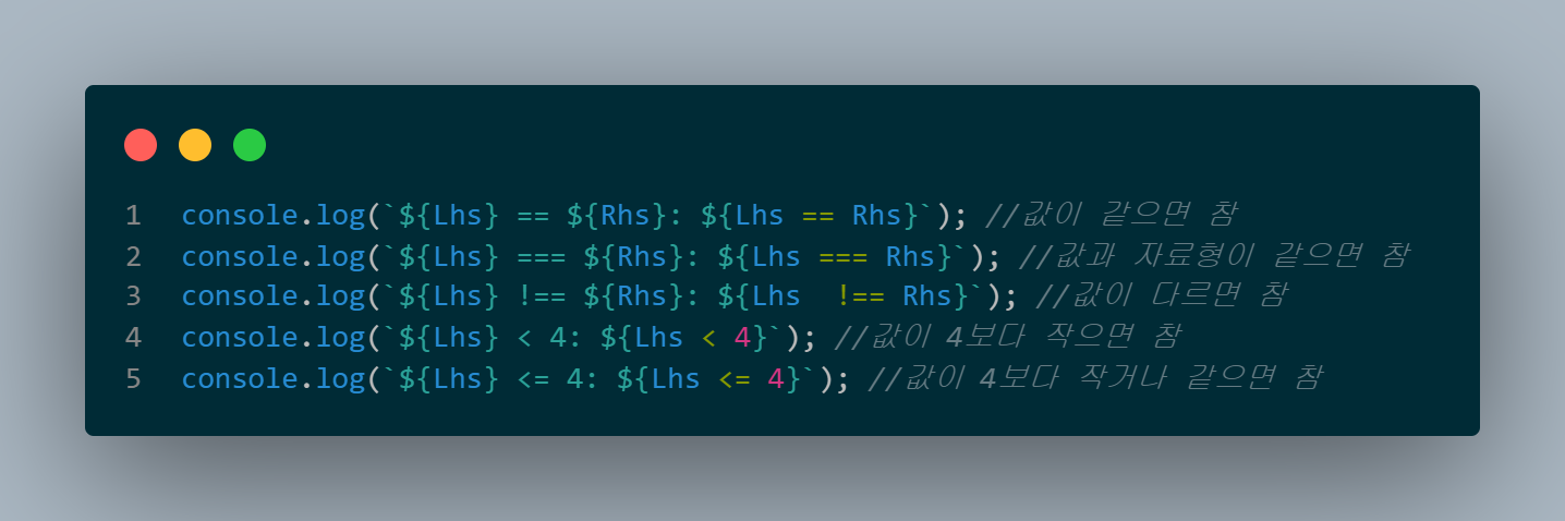 비교 연산자에는 다음과 같은 종류의 연산자들이 있다.