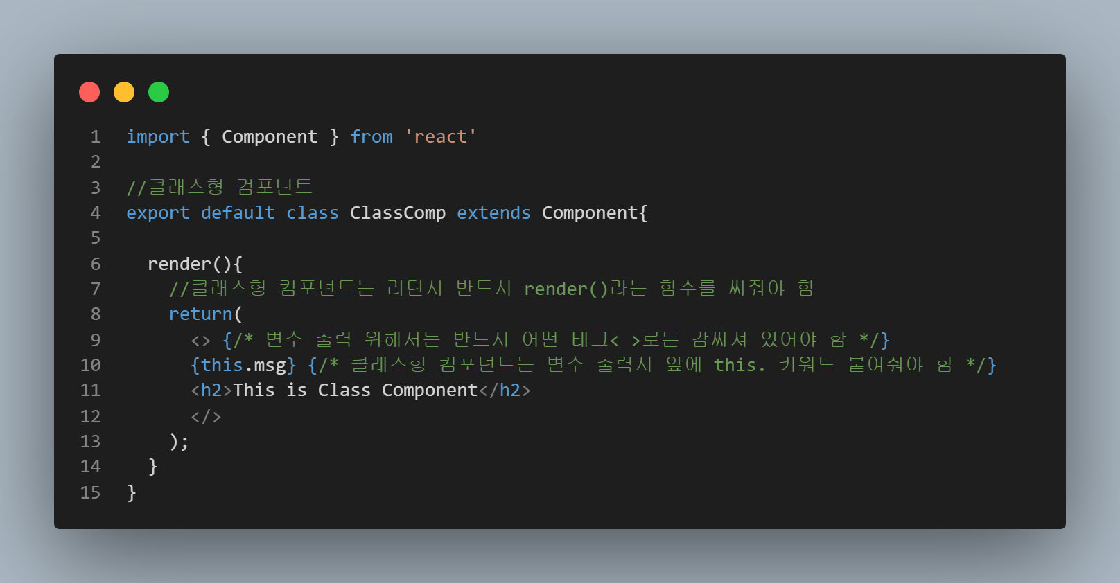 1. 클래스형 컴포넌트는 리턴해주기 위해 render( )라는 함수를 써야한다.