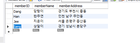 SELECT * FROM membertbl WHERE memberName = '당탕이';