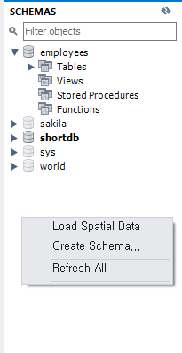 만들어진 스키마 내의 Tables칸을 마우스 우클릭을 하면