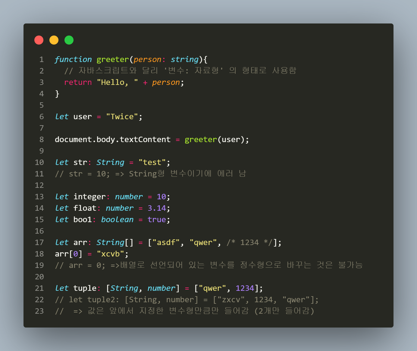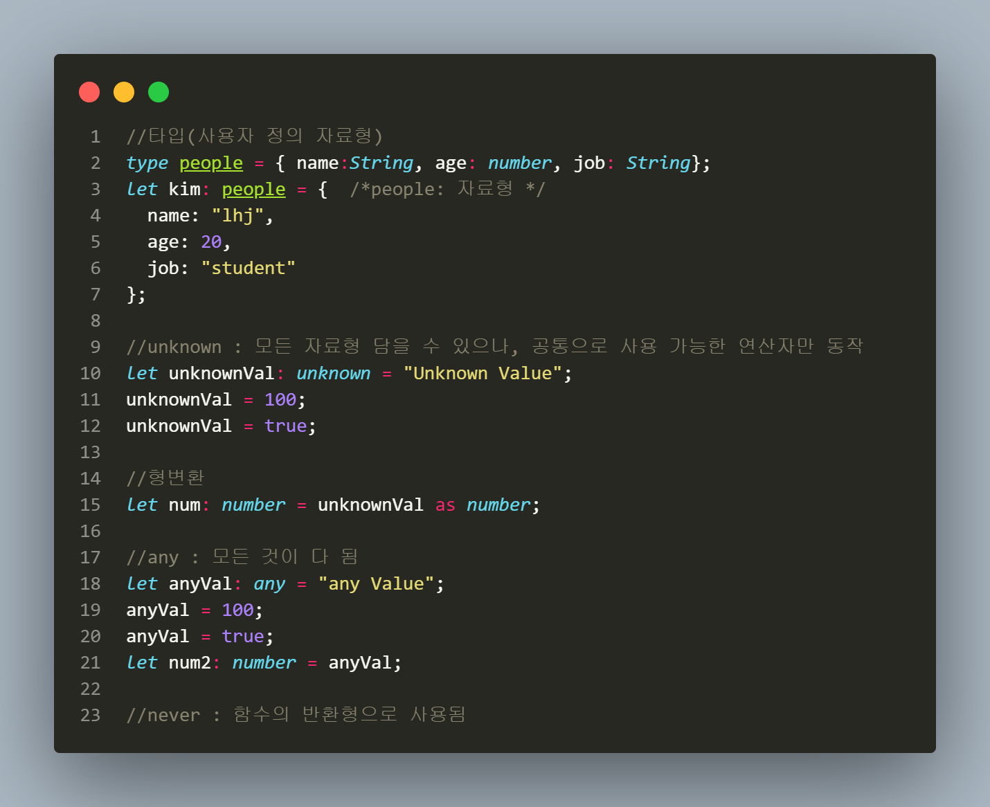 TypeScript에 존재하는 변수형은 다음과 같다.