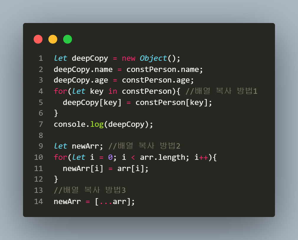 앞서 1) 값 변경을 할 때, 배열이 얕은 복사되는 모습을 확인할 수 있었다.