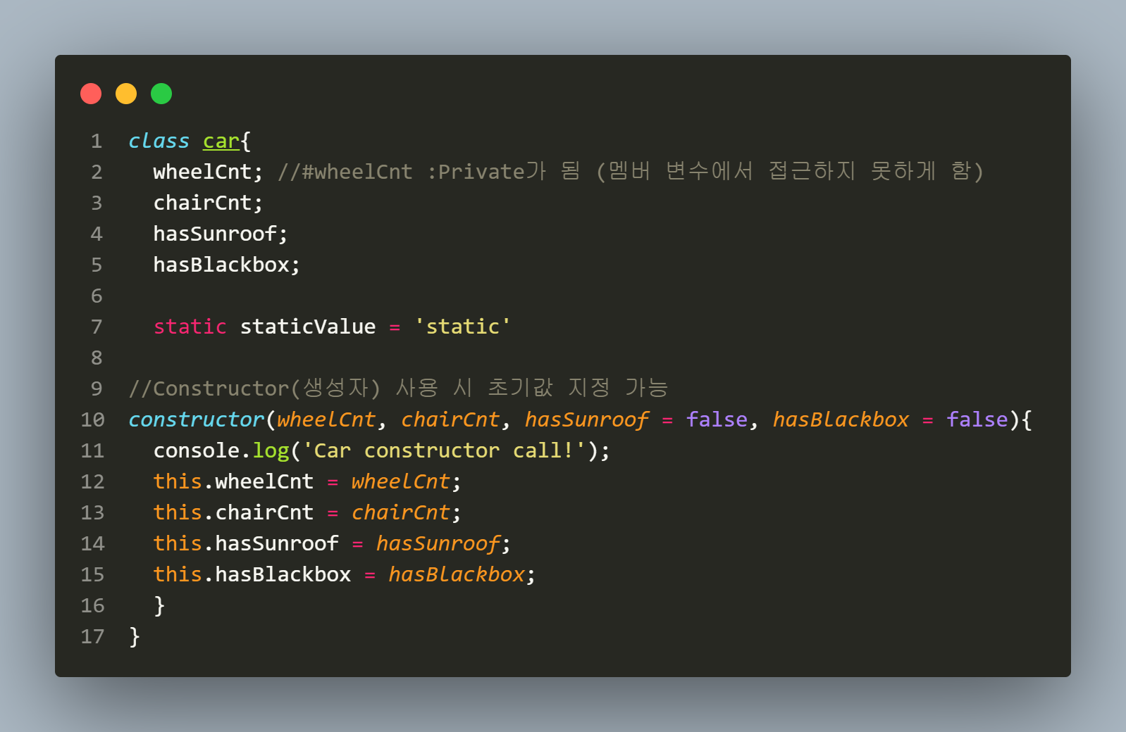 멤버 변수로 wheelCnt, chairCnt, hasSunroof, hasBlckbox를 가지고 있다.